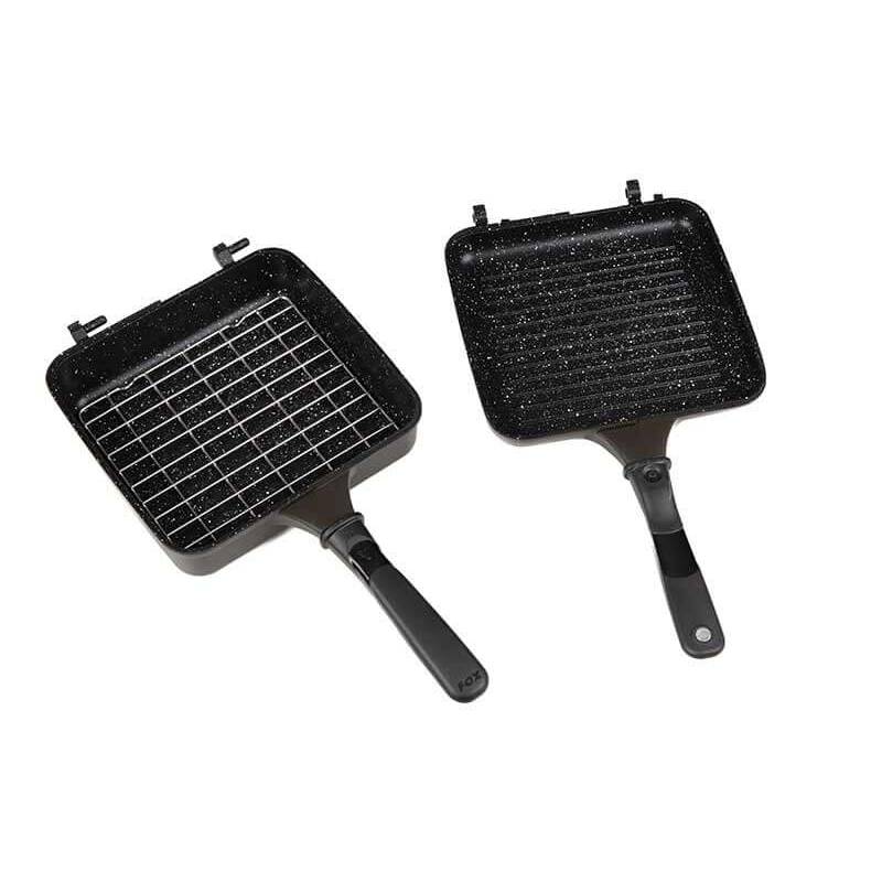 Une grille en acier inoxydable empêche les aliments de toucher directement la surface de cuisson, réduisant les risques de brûlure. Les charnières et poignées amovibles permettent d’utiliser chaque poêle indépendamment et de les ranger facilement pour un gain de place optimal.